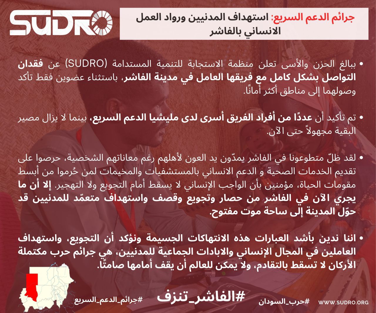 • With deep sorrow and concern, the Sustainable Development Response Organization (SUDRO) announces the loss of communication with its entire team working in El Fasher, except for two members who have safely reached more secure areas.